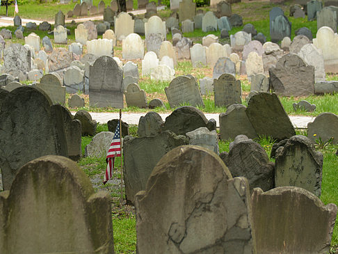 Der Old Granary Burying Ground ist einer der ältesten Friedhöfe der Stadt Boston: Er stammt aus dem Jahr 1660 und liegt an der Tremont Street, östlich des Boston Common 33. Da die Begräbnisstätte zu ihrer Entstehungszeit im südlichen Teil der Stadt lag, erhielt sie den Namen South Burying Ground. Als Boston allerdings wuchs und sich auch nach Süden ausdehnte, passte der Name nicht mehr - Daher wurde der Friedhof konsequenterweise zunächst in Middle Burying Ground umbenannt. Seinen heutigen Namen erhielt er letztendlich im Jahr 1737. Das "Granary" verweist dabei auf den alten Getreidespeicher der Stadt - Dieser stand einst direkt neben dem Friedhof; heute findet man hier die Park Street Church 36. Da man sich nun mit dem Namen des Friedhofes geografisch nicht mehr festlegte, musste man ihn auch nicht noch einmal umbenennen – die Stadt Boston wuchs immerhin noch weiter!