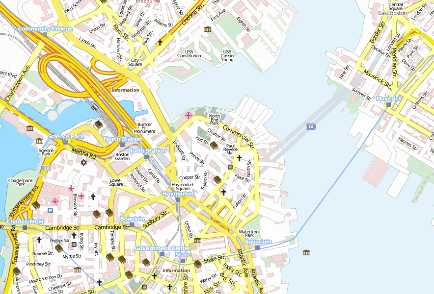 Im Umkreis sind bekannte Orten wie Bova’s Bakery, Paul Revere Mall oder Old North Church. Passend sind auch folgende Stadtpläne: Boston Tea Party Ship, Museum of Fine Arts, Cambridge und Harvard University